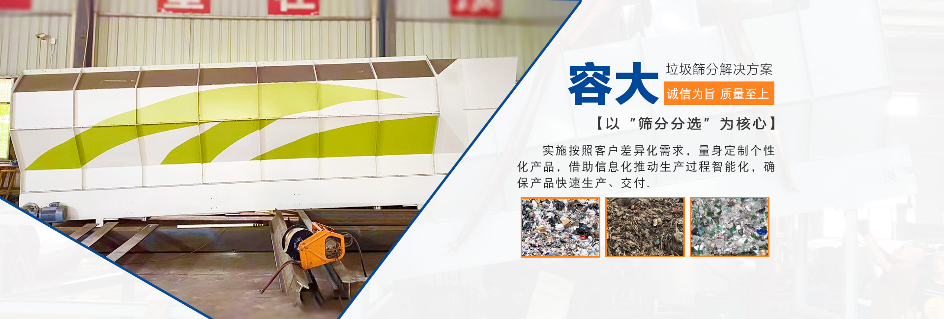 泉州容大機械有限公司是一家專研生活垃圾分選的企業(yè),以“篩分分選”為核心,實施按照客戶差異化需求,量身定制個性化產(chǎn)品,柔性化生產(chǎn)管理模式,以智能制造為主攻方向,以客戶需求為中心,借助信息化推動生產(chǎn)過程智能化,確保產(chǎn)品快速生產(chǎn)、交付。生活垃圾處理領域內的技術研究,利用篩分、分選技術的核心競爭力,圍繞“智能、高效、節(jié)能、環(huán)保”八個大字為中心,為循環(huán)經(jīng)濟項下的各種生活垃圾處理項目提供成套的技術解決方案 ...